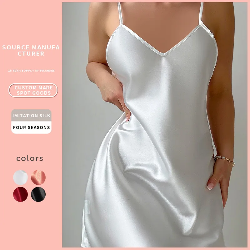 European American Style Home Dress for Spring Summer Solid Satin Spaghetti Strap Nightgown for Slip Cross-Border Thin Elastic